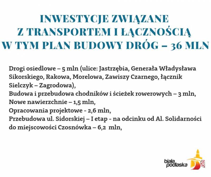 - wydatki na na komunikację miejską (nieodpłatną od 1.09.2022 r. dla uczniów szkół podstawowych mieszkających w Białej Podlaskiej), remonty i zimowe utrzymanie dróg i chodników – 16 mln zł,