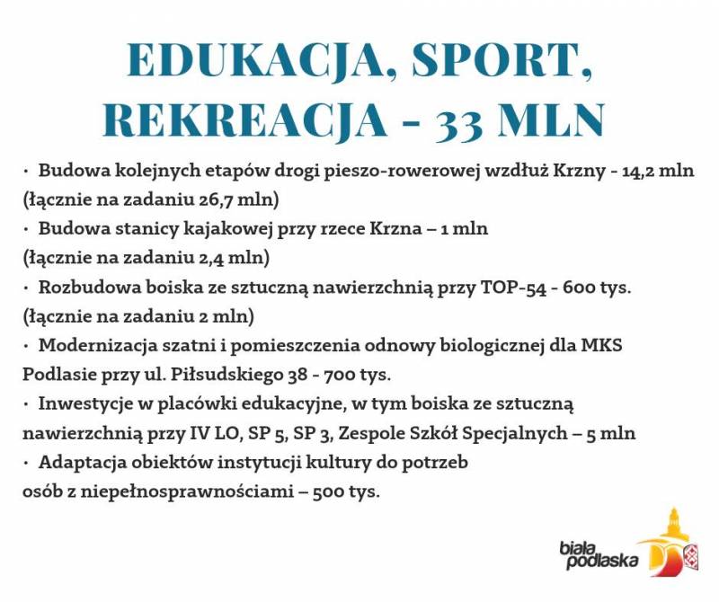 - wydatki na edukację, kulturę, sport i potrzeby osób z niepełnosprawnościami – 33 mln zł,
