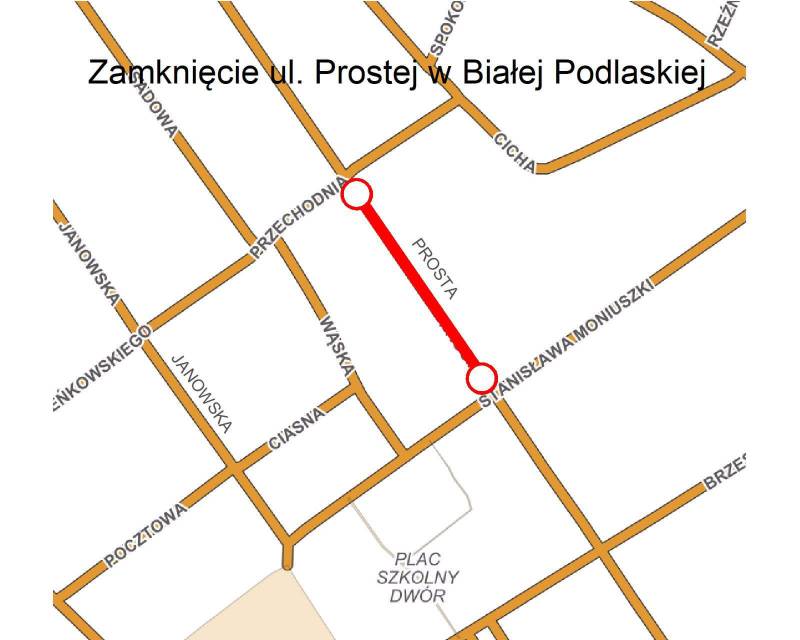 Trwa wymiana górnej warstwy nawierzchni na ul. Prostej, w związku z tym wyłączony z ruchu pojazdów jest jej odcinek od skrzyżowania z ul. Przechodnią do skrzyżowania z ul. Moniuszki.