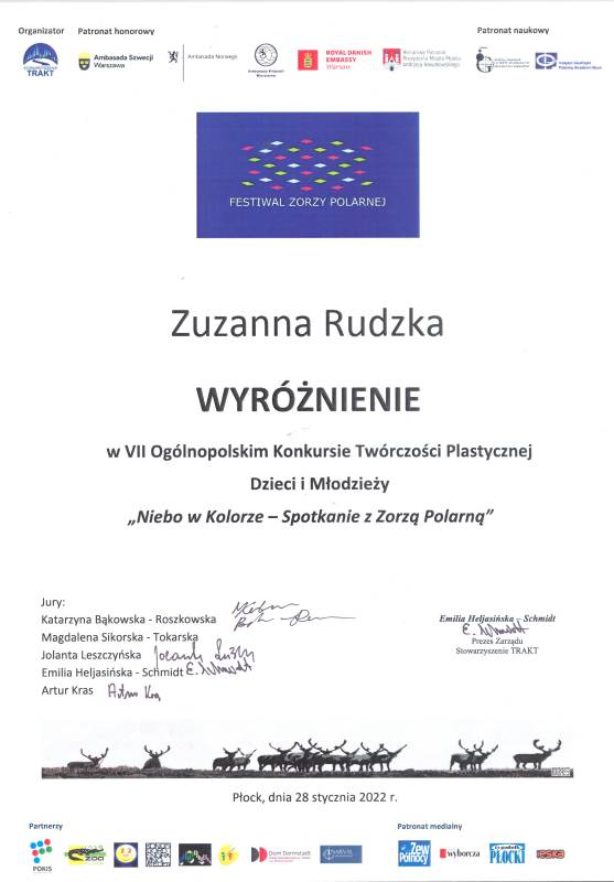 Poziom artystyczny, dojrzałość i nieokiełznana wyobraźnia Zuzanny sprawiły że w opinii jury VII Ogólnopolskiego Konkursu Twórczości Plastycznej Dzieci i Młodzieży „Niebo w Kolorze – Spotkanie z Zorzą Polarną" otrzymała WYRÓŻNIENIE!!!
