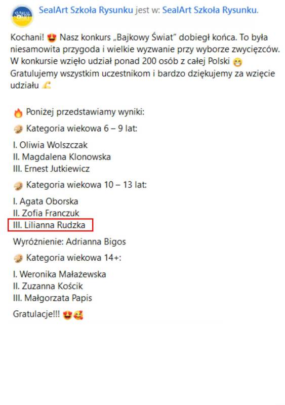 Znamy laureatów Ogólnopolskiego Konkursu Plastycznego „Bajkowy Świat", zorganizowanego przez SealArt Szkołę Rysunku w Warszawie!!!