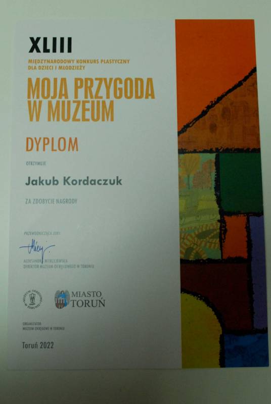 W piątek 16 września b.r. w Sali Mieszczańskiej Ratusza Staromiejskiego w Muzeum Okręgowym w Toruniu, odbyło się uroczyste rozdanie nagród XLIII Międzynarodowego Konkursu Plastycznego dla Dzieci i Młodzieży „Moja przygoda w muzeum". Na konkurs nadesłano 1024 prac m.in ze Słowacji, Argentyny, Chorwacji. Wśród 21 nagrodzonych autorów znalazło się aż trzech podopiecznych z naszego Bialskiego Centrum Kultury.