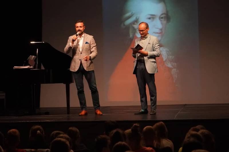 Dzisiejsze "Opowiastki o Mozarcie" zgromadziły dziecięcą publiczność - uczniowie naszych szkół byli zachwyceni koncertem krakowskich artystów: sopranistki Joanny Trafas (autorki scenariusza i wspaniałej narratorki widowiska), basa-barytonu Stanisława Dudy oraz pianistki Emilii Bernackiej-Głowali. To nie tylko wyjątkowi muzycy, ale i prawdziwi znawcy dziecięcej natury - po takiej lekcji o Mozarcie każdy słuchacz staje się bogatszy o niezwykle ciekawie przekazaną wiedzę o muzyce. Usłyszeliśmy znane arie i duety z oper W.A. Mozarta, ale także „przebojowe" utwory instrumentalne w układzie na fortepian.