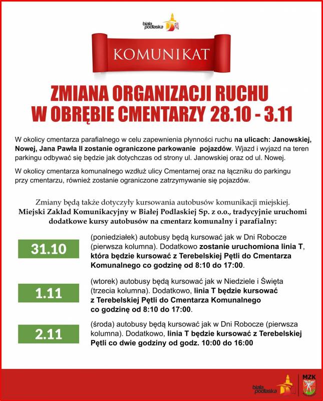 Zmiana organizacji ruchu w okolicy cmentarzy oraz świąteczny rozkład jazdy autobusów MZK Biała Podlaska