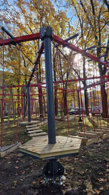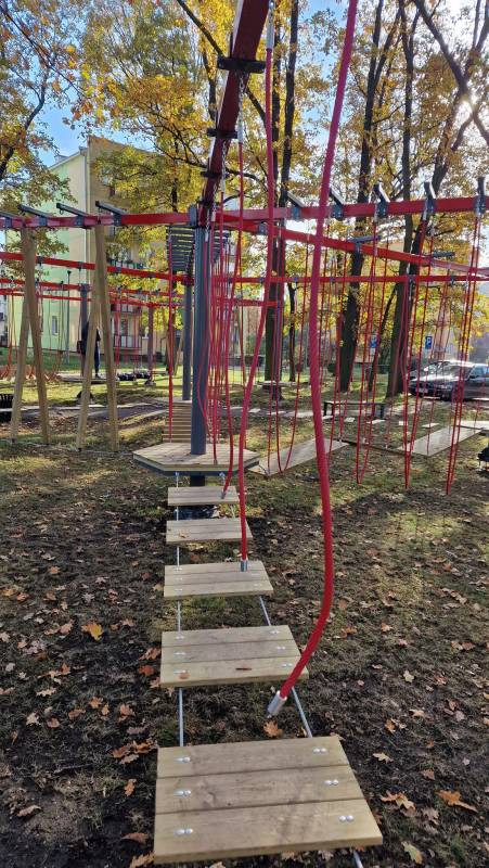 W ramach inwestycji Parku Linowego wykonano 3 moduły o różnych stopniach trudności, w których skład wchodzi 15 platform, 21 przeszkód i 9 mini trampolin. Dodatkowo zainstalowano ławki parkowe, stojaki na rowery, barierki chodnikowe oraz kosze na śmieci.