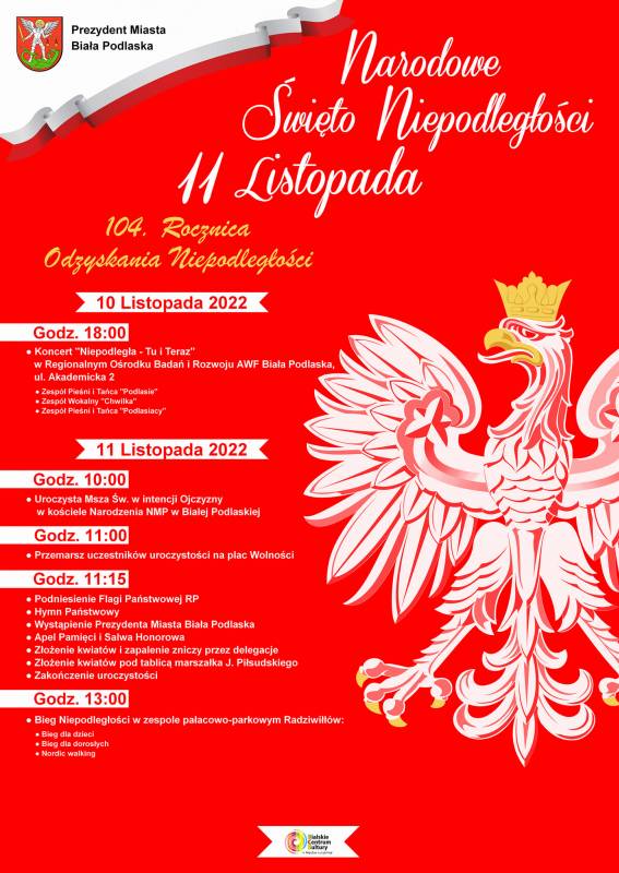 Uroczystości rozpoczną się 10 listopada br. o godzinie 18:00 w Regionalnym Ośrodku Badań i Rozwoju AWF Biała Podlaska (ul. Akademicka 2) koncertem pt. "Niepodległa - Tu i Teraz". Na scenie wystąpią: Zespół Pieśni i Tańca Podlasie, Zespół wokalny Chwilka, Zespół Pieśni i Tańca "Podlasiacy".
