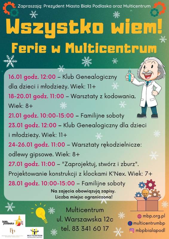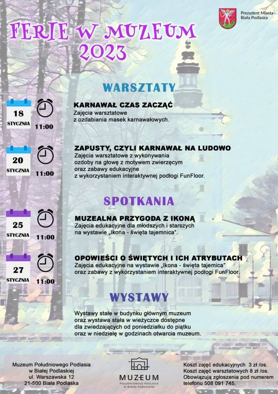 Zachęcamy do zapoznania się z bogatą ofertą zajęć, warsztatów i plenerów fotograficznych przygotowanych przez pracowników Bialskiego Centrum Kultury im. B. Kaczyńskiego, Muzeum Południowego Podlasia, Miejskiej Biblioteki Publicznej oraz agend podległych.