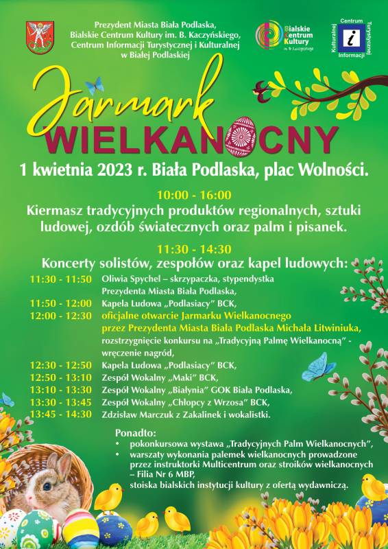 Tradycyjnie o godzinie 12:00 prezydent miasta Michał Litwiniuk oficjalnie otworzy Jarmark Wielkanocny oraz wręczy nagrody laureatom konkursu na "Tradycyjną Palmę Wielkanocną".