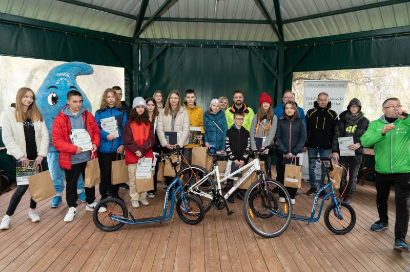Gratulacje dla zwycięzców konkursu, w którym nagrodami były: rower, hulajnogi oraz gadżety sportowe.