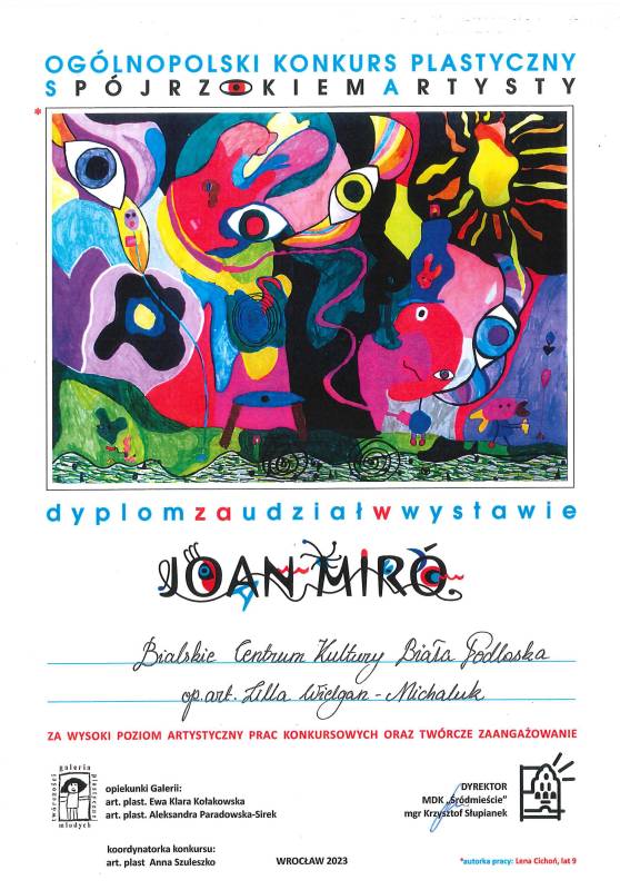 Znamy laureatów Ogólnopolskiego Konkursu Plastycznego „Spójrz Okiem Artysty - Joan Miró" !!! Wśród laureatów znalazły się młode artystki z Pracowni Grafiki Komputerowej „Piksel" z Bialskiego Centrum Kultury!!!