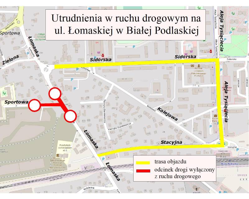 Informujemy, że w dniu 17.08.23 r. (czwartek) rozpocznie się układanie nawierzchni bitumicznejna ul. Łomaskiej i ul. Sportowej w Białej Podlaskiej. W związku z tym nastąpią utrudnienia w ruchu drogowym. Ul. Łomaska zostanie częściowo wyłączona z ruchu. Objazdy zamkniętego odcinka będą odbywać się zgodnie z powyższym schematem ulicami: Łomaską, Sidorską, Alejami Tysiąclecia, Stacyjną. Prace zaplanowane są na 2 dni robocze. Prosimy zachować ostrożność.