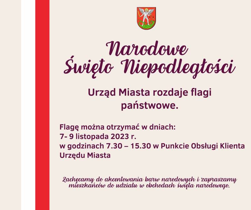 Z inicjatywy prezydenta Michała Litwiniuka w okresie poprzedzającym Narodowe Święto Niepodległości Urząd Miasta po raz kolejny rozdaje mieszkańcom flagi narodowe. Zachęcamy do akcentowania barw narodowych i zapraszamy mieszkańców do udziału w uroczystościach 11 listopada.