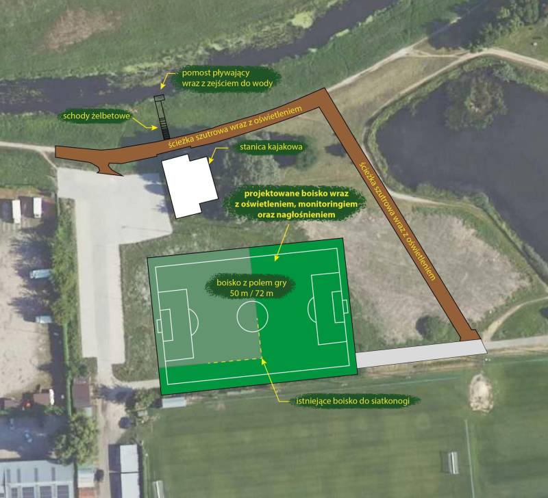 W ramach inwestycji planowana jest rozbudowa boiska do wymiarów 50 x 72 m, wykonanie oświetlenia, malowanie linii, zakup i obsadzenie bramek piłkarskich z siatkami, ogrodzenie boiska piłkochwytami, wykonanie kompletnego okablowania nagłośnienia wraz z wprowadzeniem kabli do masztów monitoring terenu oraz wykonanie szutrowej ścieżki pieszo-rowerowej wokół terenu, zejścia do wody wraz z trapem i pomostem pływającym.