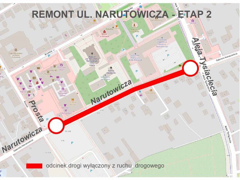 Do dnia 17.05.2024 r. w godzinach od 18.00 do 4.00 ul. Narutowicza od skrzyżowania z ul. Prostą do skrzyżowania z Al. Tysiąclecia zostanie wyłączona z ruchu pojazdów.