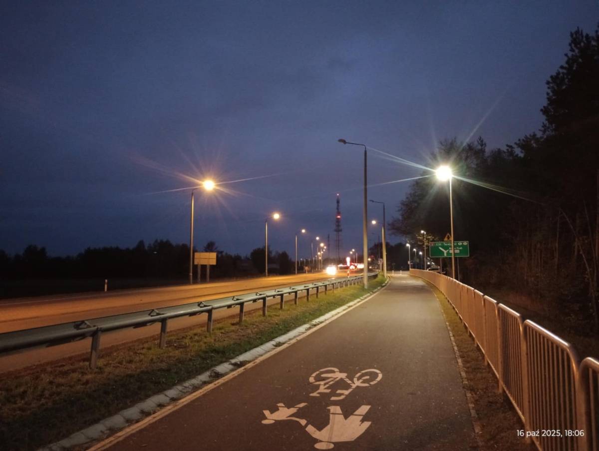 Niesprawne oświetlenie uliczne przy DK2 wzdłuż nowo wybudowanej drogi dla rowerów.