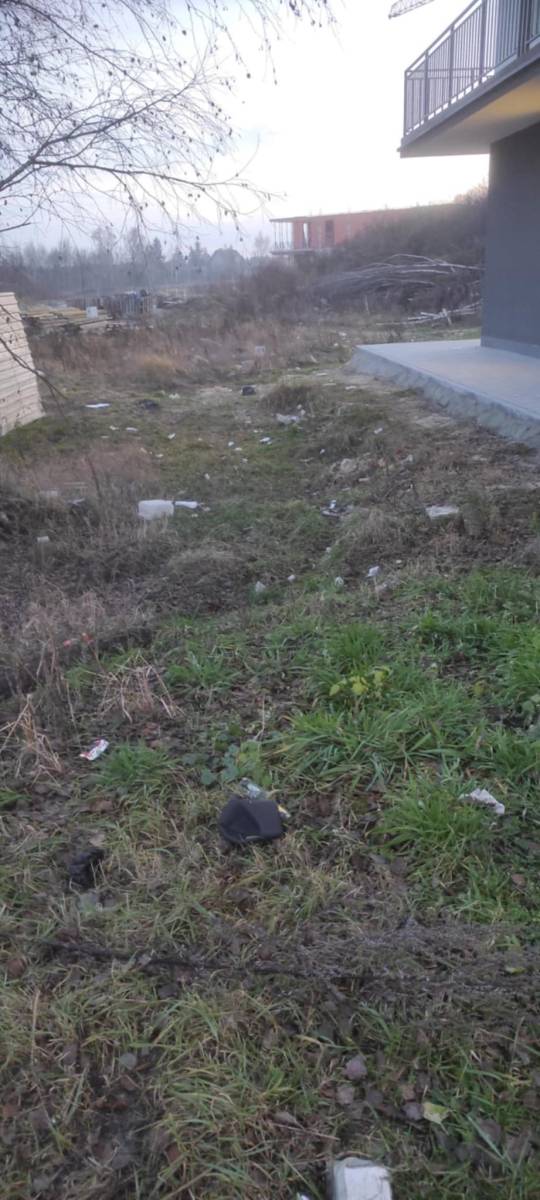 Zaśmiecony pas zieleni przy ulicy Armii Krajowej, pomiędzy blokiem Witolda Pileckiego 31A a nową budową Twardowskich. Odpady budowlane, śmieci, worki na śmieci.
