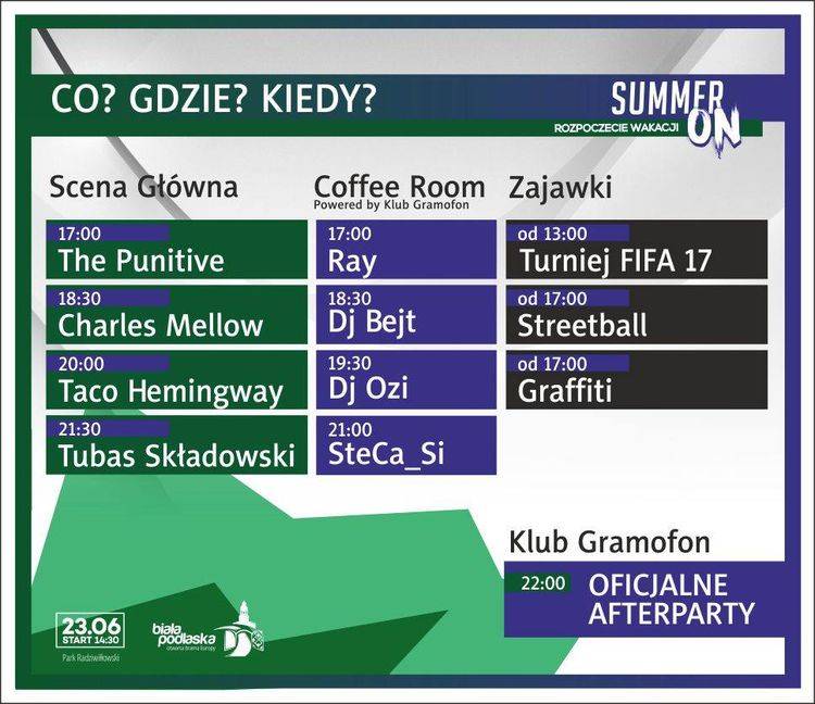 Podczas Summer On zagra także grupa „The Punitive”, zwycięzca „Garage Open Festival” - konkursu dla młodych kapel organizowanego przez Bialskie Centrum Kultury. Będziemy gościć także Białorusinów. Za głównej scenie zagra „Charles Mellow”, zespół grający melodyjny rock rodem z Brześcia.
