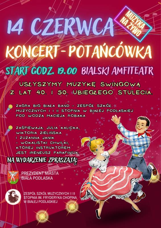 Prezydent Miasta Biała Podlaska Michał Litwiniuk i Zespół Szkół Muzycznych I i II stopnia im. Fr. Chopina w Białej Podlaskiej zapraszają na swingową potańcówkę przy muzyce granej na żywo!