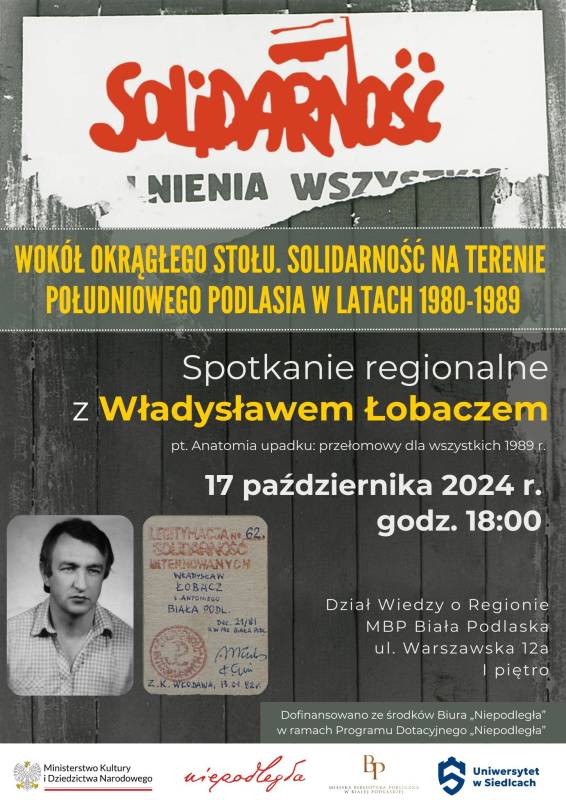 Zapraszamy na spotkanie regionalne z Władysławem Łobaczem, które zostanie zorganizowane w Dziale Wiedzy o Regionie Miejskiej Biblioteki Publicznej w Białej Podlaskiej w ramach projektu "Wokół Okrągłego Stołu. Solidarność południowego Podlasia w latach 1980-1989".