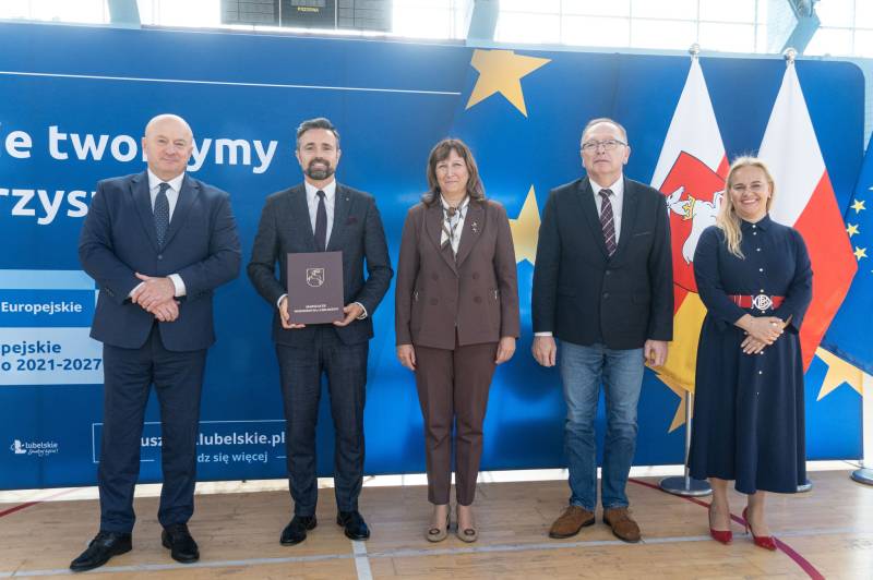 Umowę odebrał Prezydent Miasta Michał Litwiniuk z Naczelnikiem Wydziału Edukacji i Spraw Społecznych Stanisławem Romanowskim oraz wicedyrektor Martą Stańczuk z rąk Marszałka Województwa Lubelskiego Jarosława Stawiarskiego.