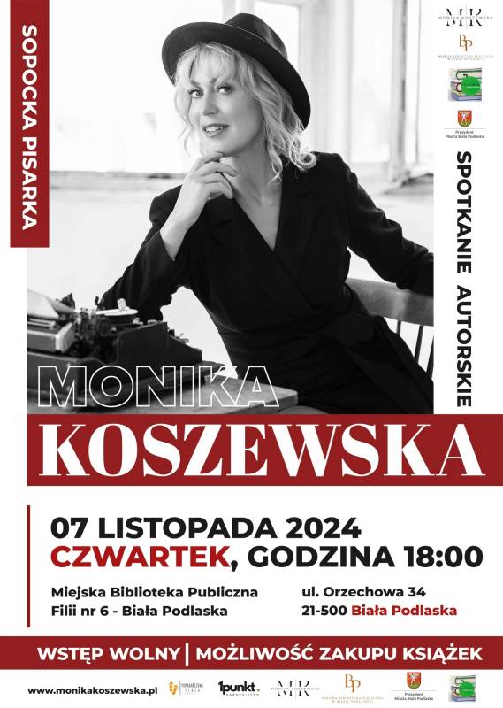 Spotkanie autorskie z pisarką Moniką Koszewską odbędzie się 7 listopada w Filii nr 6 Miejskiej Biblioteki Publicznej przy ul. Orzechowej 34. Początek o godz. 18:00. Wstęp wolny!