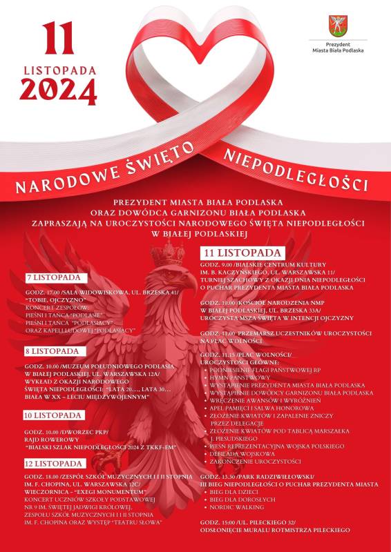 11 listopada br. o godzinie 9:00 w Bialskim Centrum Kultury odbędzie się Turniej Szachowy z okazji Dnia Niepodległości. Tego samego dnia o godzinje 10:00 odprawiona zostanie msza święta w intencji Ojczyzny w kościele Narodzenia Najświętszej Maryi Panny, po której nastąpi przemarsz na plac Wolności i rozpoczęcie oficjalnych uroczystości. O 13:30 zapraszamy do założenia pałacowo-parkowego Radziwiłłów, gdzie odbędzie się Bieg Niepodległości na dystansie 6 km. Organizatorem wydarzenie jest Klub Biegacza Biała Biega. O godzinie 15:00 nastąpi uroczyste odsłonięcie muralu Rotmistrza Witolda Pileckiego.