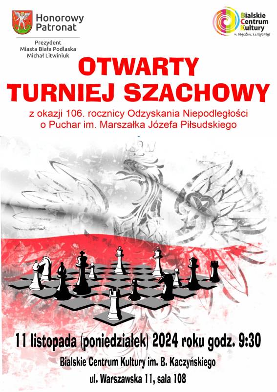 Zapraszamy wszystkich miłośników szachów do udziału w otwartym turnieju, który organizowany jest z okazji 106. rocznicy odzyskania przez Polskę Niepodległości.