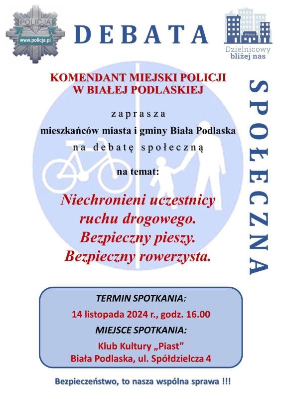 Debata społeczna "Niechronieni uczestnicy ruchu drogowego. Bezpieczny pieszy. Bezpieczny rowerzysta" organizowana przez Bialską Policję odbędzie się 14 listopada o godz. 16:00 w Klubie Kultury Piast.