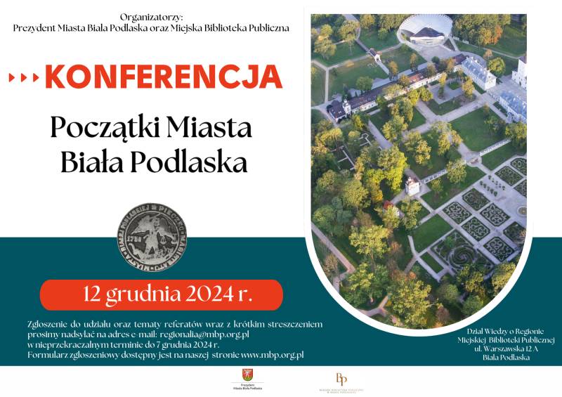 Prezydent miasta Michał Litwiniuk oraz Miejska Biblioteka Publiczna w Białej Podlaskiej zapraszają naukowców, doktorantów, studentów i regionalistów do udziału w konferencji popularnonaukowej pt. „Początki Miasta Biała Podlaska".