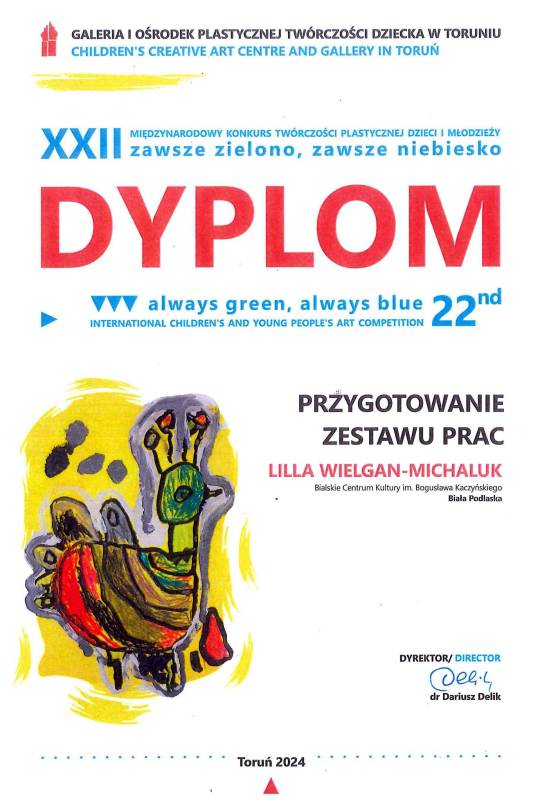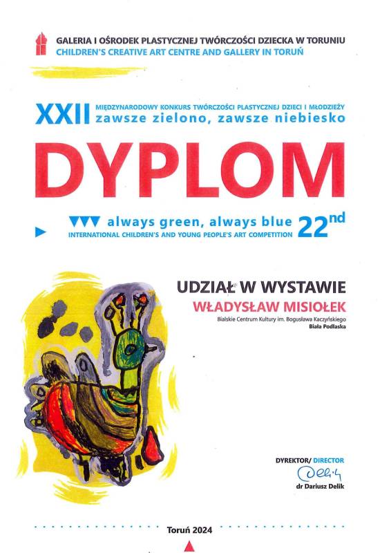 Gratulujemy Władysławowi Misiołkowi, młodemy grafikowi z Pracowni Grafiki Komputerowej "Piksel", który znalazł się w gronie laureatów XXII edycji Międzynarodowego Konkursu Twórczości Plastycznej Dzieci i Młodzieży „Zawsze Zielono, Zawsze Niebiesko 2024".