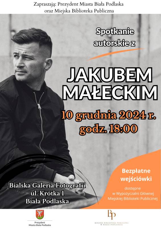Prezydent miasta Michał Litwiniuk oraz Miejska Biblioteka Publiczna w Białej Podlaskiej zapraszają na spotkanie autorskie z Jakubem Małeckim - pisarzem, autorem m.in. Dygotu, Rdzy i Święta ognia.