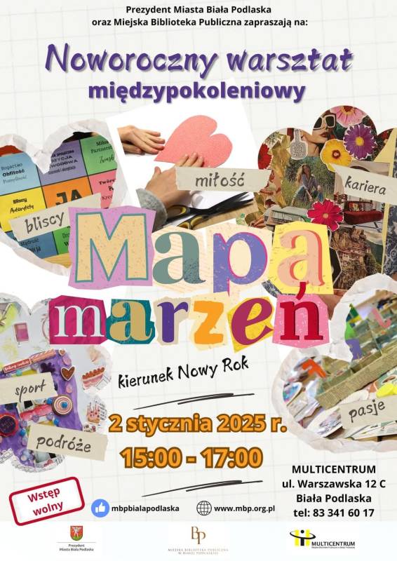 Multicentrum przygotowało noworoczny, bezpłatny warsztat międzypokoleniowy "Mapa marzeń", który odbędzie się 2 stycznia 2025 r. o godzinie 15:00.