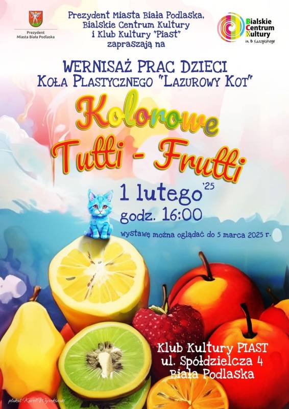 Wernisaż wystawy prac dzieci z Koła Plastycznego „Lazurowy Kot” pt. „Kolorowe Tutti Frutti” odbędzie się sobotę, 1 lutego o godz. 16:00 w Klubie Kultury PIAST przy ul. Spółdzielczej 4.