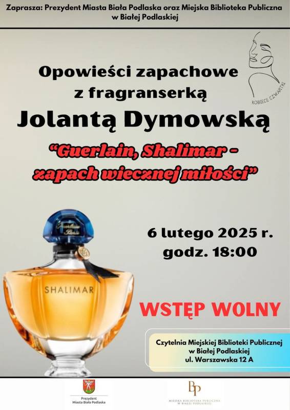 Pierwsze spotkanie w ramach Kobiecych Czwartków odbędzie się już 6 lutego br. o godzinie 18:00 w Czytelni Miejskiej Biblioteki Publicznej, a gościem będzie Jolanta Aleksandra Dymowska, która zabierze nas w świat zapachów.