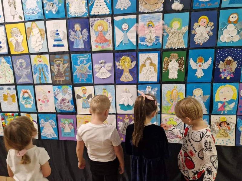 Do 6 lutego 2025 r. w przedszkolu można oglądać wystawę pokonkursową. Anioły tworzą oryginalną dekorację i emanują świątecznym nastrojem.