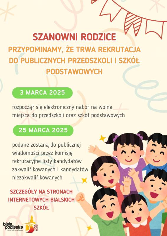 Trwa rekrutacja do przedszkoli i szkół podstawowych na terenie miasta Biała Podlaska na rok szkolny 2025/2026. Termin składania wniosków to 17 marca 2025 r.