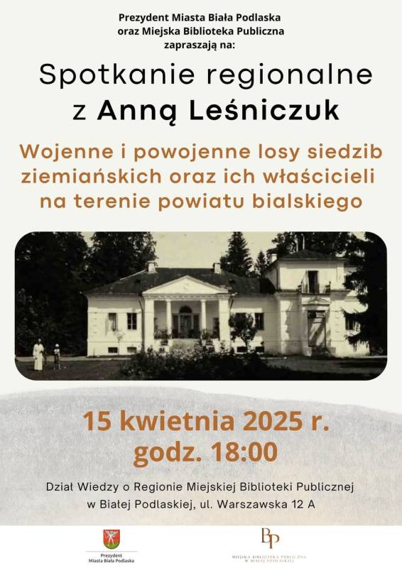 Spotkanie regionalne z Anną Leśniczuk pod hasłem "Wojenne i powojenne losy siedzib ziemiańskich oraz ich właścicieli na terenie powiatu bialskiego" odbędzie się 15 kwietnia o godz 18:00 w Dziale Wiedzy o Regionie Miejskiej Biblioteki Publicznej w Białej Podlaskiej.
