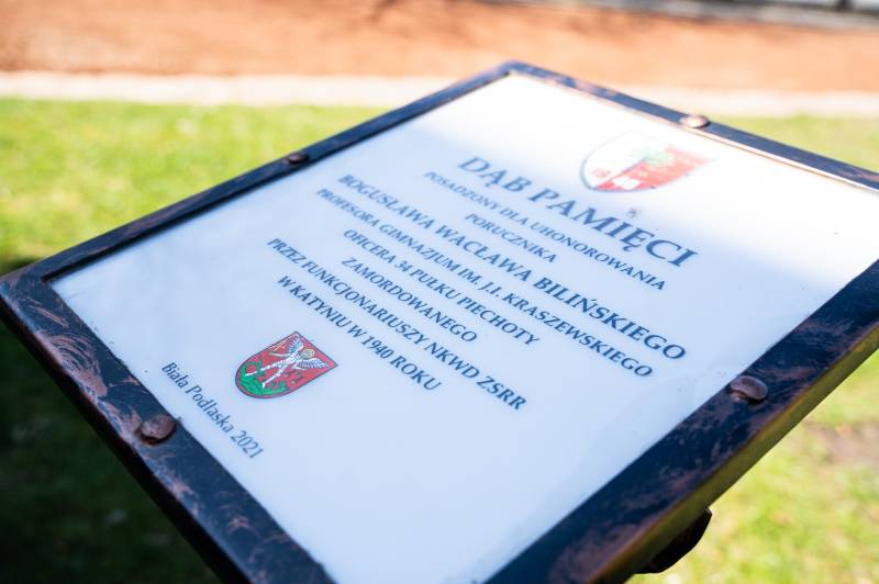 Ofiary Zbrodni Katyńskiej uczcili dziś przy Dębie Pamięci oraz tablicy przy I LO im. Józefa Ignacego Kraszewskiego w Białej Podlaskiej: w imieniu prezydenta Michała Litwiniuka wiceprezydent Justyna Gorczyca wraz z mjr. Łukaszem Dzięcielskim, zastępcą 18. Batalionu Rozpoznawczego, który reprezentował dowódcę garnizonu Biała Podlaska płk. Pawła Szymańskiego oraz z naczelnikiem Wydziału Kultury, Edukacji i Sportu dr. Stanisławem Romanowskim, Henrykiem Nędziakiem komendantem Straży Miejskiej, Beatą Demianiuk, naczelnikiem Wydziału Kultury, Sportu i Współpracy z Ogranizacjami Pozarządowymi, Krzysztofem Trochimiukiem, prezesem MZK Biała Podlaska i delegacją I Liceum Ogólnokształcącego.