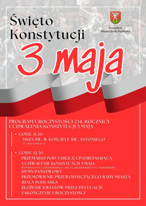 Prezydent miasta Michał Litwiniuk zaprasza na obchody Święta Konstytucji 3 Maja. Rozpoczną się one o godz. 11.30 mszą świętą w kościele św. Antoniego.