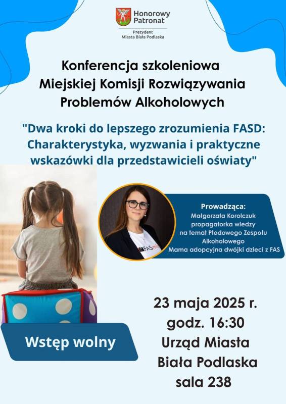 Miejska Komisja Rozwiązywania Problemów Alkocholowych Miasta Biała Podlaska zaprasza na konferencję szkoleniową pod hasłem „Dwa kroki do lepszego zrozumienia FASD: Charakterystyka, wyzwania i praktyczne wskazówki dla przedstawicieli oświaty” organizowaną pod patronatem prezydenta miasta Michała Litwiniuka. Odbędzie się ona 23 maja o godz. 16:30 w sali 238 Urzędu Miasta Biała Podlaska.