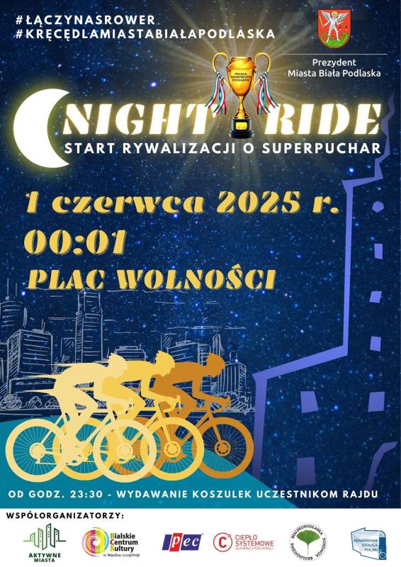 Spotykamy się o północy 1 czerwca, a wcześniej można będzie odbierać koszulki (dla posiadaczy aplikacji kręcących dla miasta Biała Podlaska) Nocą ruszymy na nasz pierwszy rajd, bądźcie z nami. Do rywalizacji zaprasza prezydent miastaprezydent miasta Michał Litwiniuk oraz Bialskie Centrum Kultury.