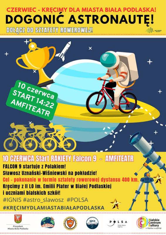 Spotkajmy się już jutro, 10 czerwca, w amfiteatrze, gdzie na dużym ekranie, wspólnie będziemy śledzić start rakiety Falcon zaplanowany na godz. 14:22 Następnie, ok godz. 15:00 wyruszy kosmiczna sztafeta rowerowa