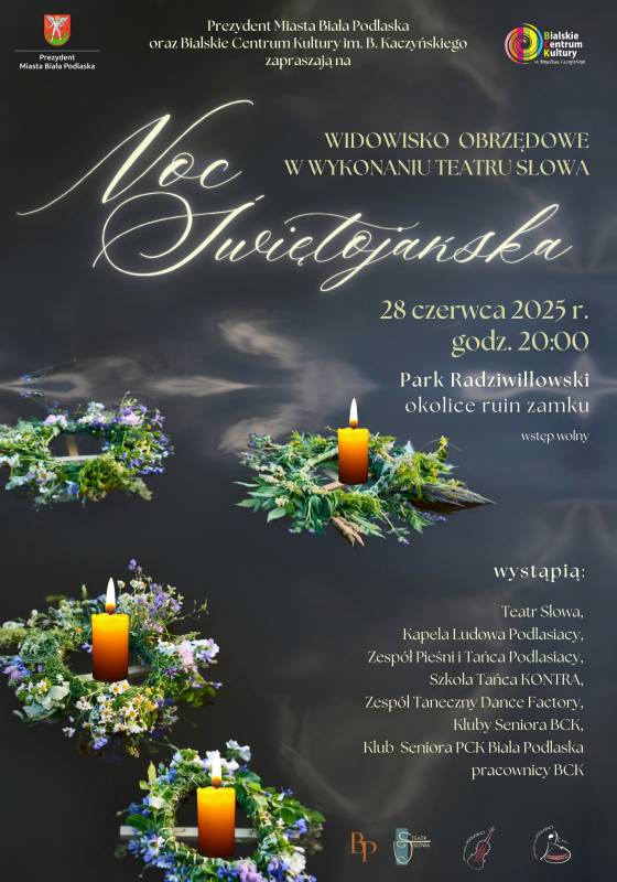 Noc Świętojańska - widowisko obrzędowe Teatru Słowa odbędzie się 28 czerwca o godz. 20:00 w założeniu Radziwiłłów. Na wydarzenie zaprasza prezydent miasta Biała Podlaska oraz Bialskie Centrum Kultury im. Bogusława Kaczyńskiego w Białej Podlaskiej.