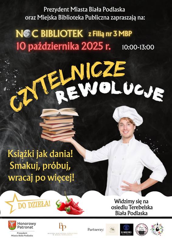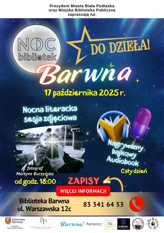 W organizację Nocy Bibliotek zaangażowane są: Barwna Multimedialna Biblioteka dla Dzieci i Młodzieży, Multicentrum, Filia nr 3 i Filia nr 6 MBP, Regionalia Biała Podlaska oraz Zespół Szkół Muzycznych im. Fryderyka Chopina.