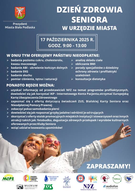 Prezydent Miasta Biała Podlaska Michał Litwiniuk zaprasza na Dzień Zdrowia Seniora, który odbędzie się 17 października 2025 roku w godzinach 9.00–13.00 w budynku Urzędu Miasta.