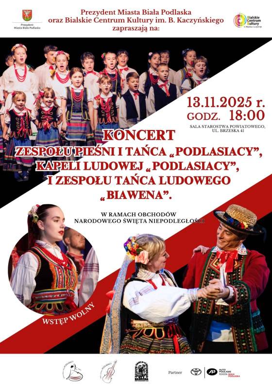 W ramach obchodów Narodowego Święta Niepodległości odbędzie się wyjątkowy koncert, podczas którego publiczność usłyszy pieśni patriotyczne i zobaczy tańce narodowe w wykonaniu Zespołu Pieśni i Tańca „Podlasiacy”, Kapeli Ludowej „Podlasiacy” oraz Zespołu Tańca Ludowego „Biawena”.