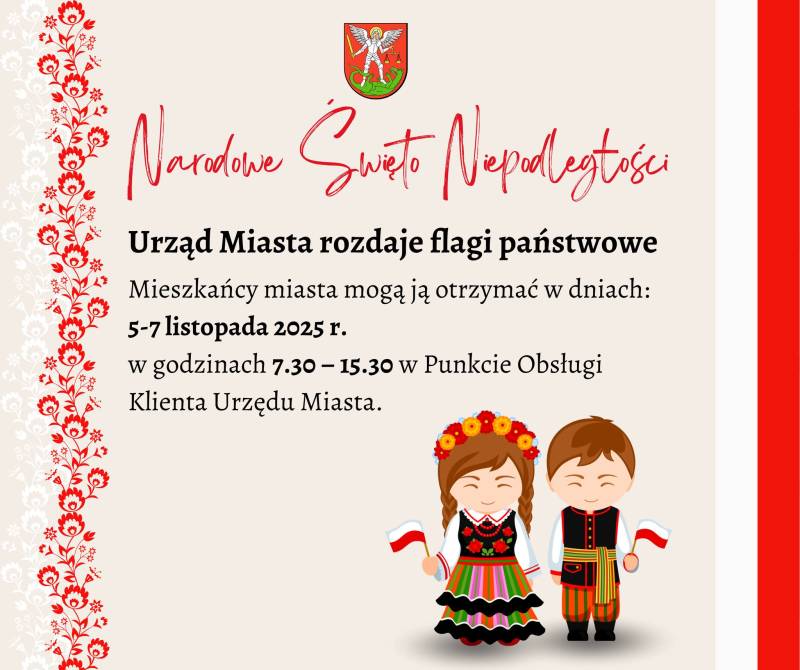 Bialczanie mogą odebrać flagi w dniach od 5 do 7 listopada 2025 roku, w godzinach 7.30–15.30, w Punkcie Obsługi Klienta Urzędu Miasta. Flagi będą wydawane do wyczerpania zapasów.