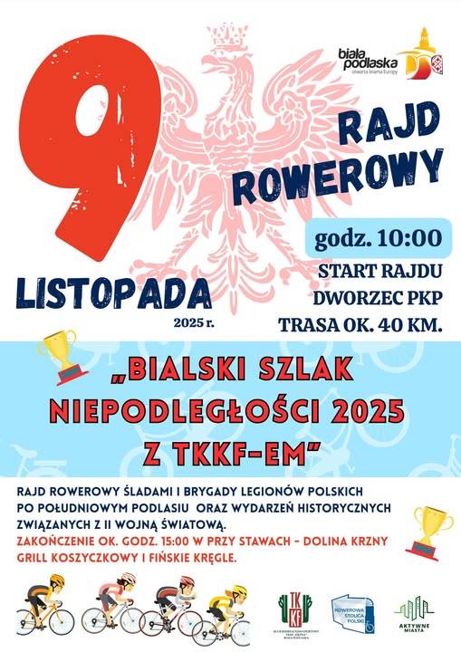 W ramach obchodów Narodowego Święta Niepodległości odbędzie się rajd rowerowy „Bialski Szlak Niepodległości z TKKF-em”. Wydarzenie rozpocznie się 9 listopada o godzinie 10.00 spod dworca PKP. Zakończenie zaplanowano około godziny 15.00 przy stawach Doliny Krzny, gdzie uczestnicy wezmą udział w spotkaniu integracyjnym przy grillu koszyczkowym.