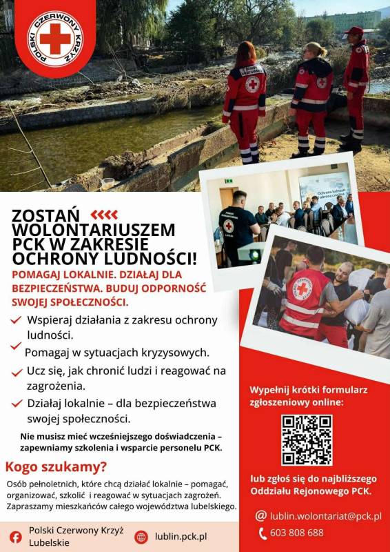 Obecnie trwa kampania informacyjna zachęcająca mieszkańców do zaangażowania się w wolontariat PCK w zakresie ochrony ludności. Wolontariuszami mogą zostać osoby pełnoletnie, zainteresowane działaniem lokalnym, zdobywaniem nowych umiejętności i reagowaniem w sytuacjach zagrożenia.