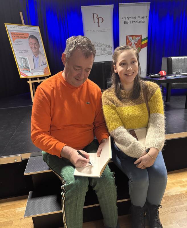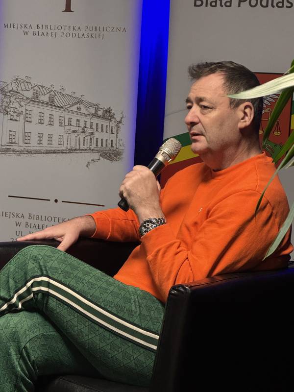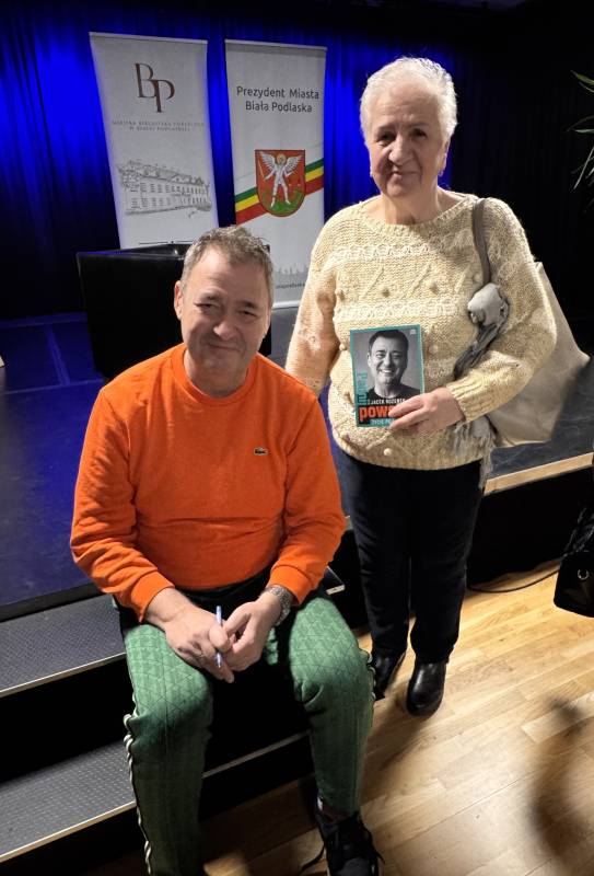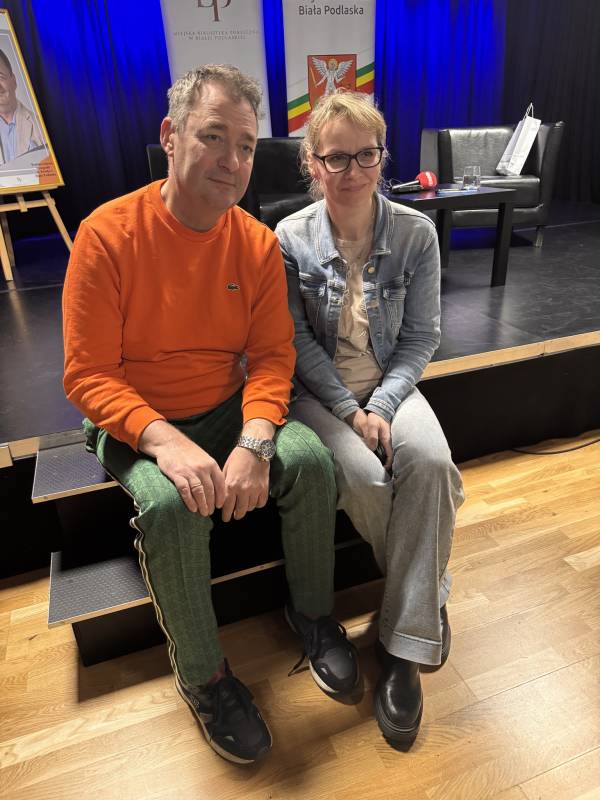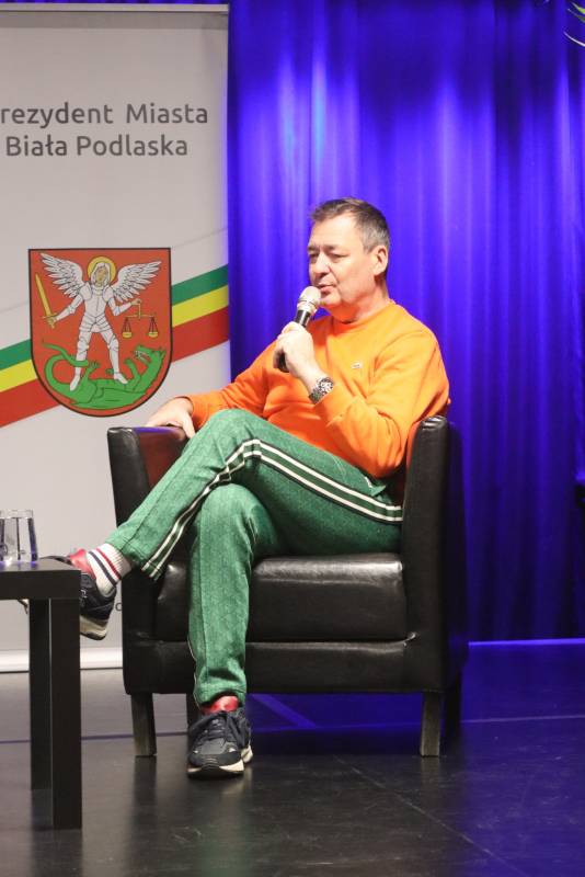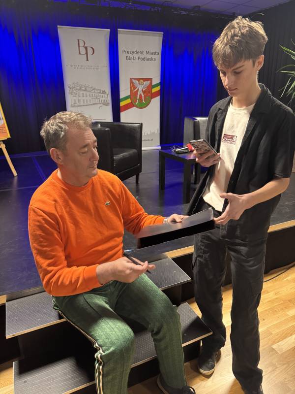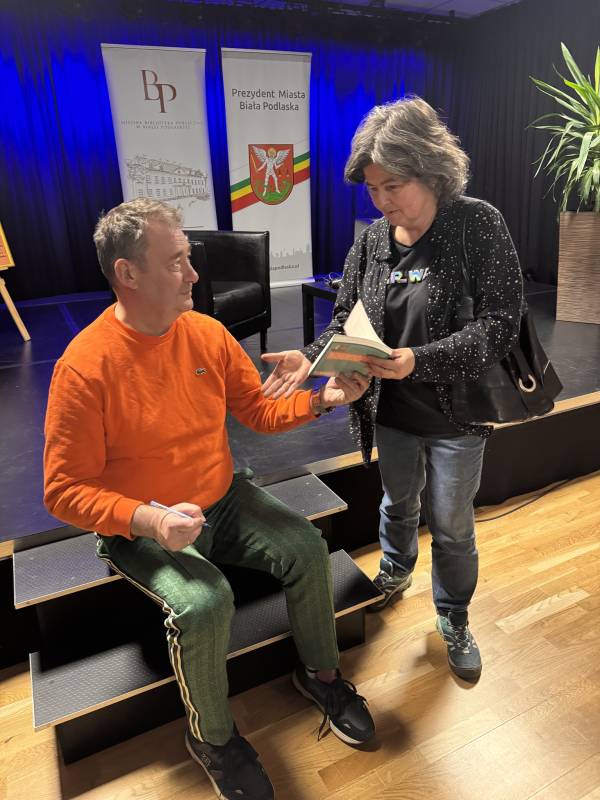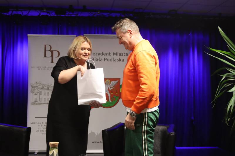 Miejska Biblioteka Publiczna w Białej Podlaskiej zaprosiła na spotkanie autorskie z aktorem, autorem książki „Padnij. Powstań. Życie po udarze”. W rozmowie z dyrektor MBP Renatą Szwed opowiadał o początkach swojej pracy aktorskiej, doświadczeniach w dubbingu, m.in. przy „Wiedźminie”, życiu po udarze, przyjaźniach w czasie choroby, roli w serialu „Barwy szczęścia” oraz swoich planach zawodowych.